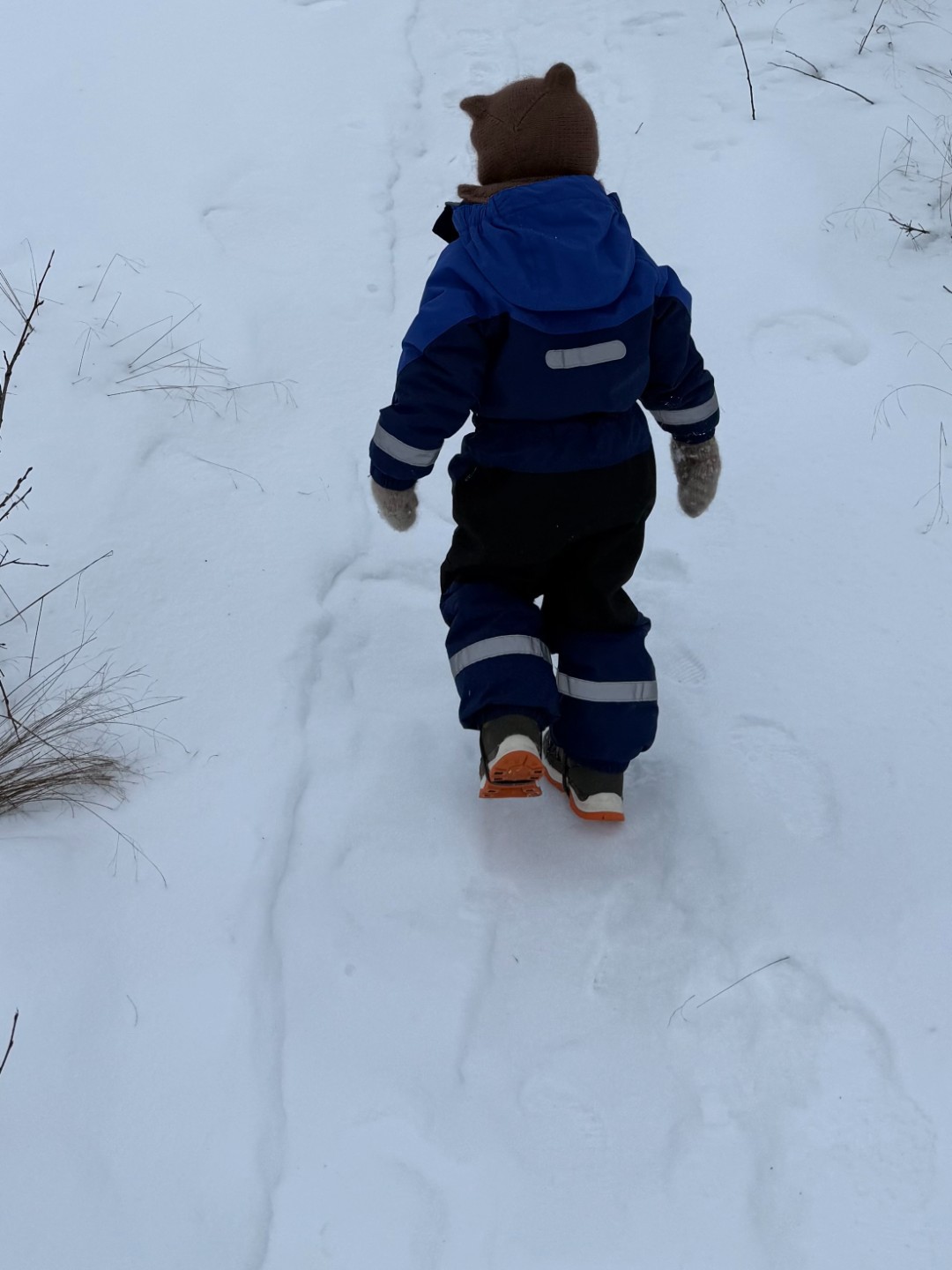 Vi går mye på tur. Da bruker vi refleksvester. Vi deler ofte inn i grupper hvis vi skal gå langs veien, så vi ikke er så mange samlet på en gang. Er vi flere har vi ofte en lang pølse-hund der det er håndtak til å holde i. Barna lærer om sikkerthet og trafikk, hvordan vi skal forholde oss langs veien.